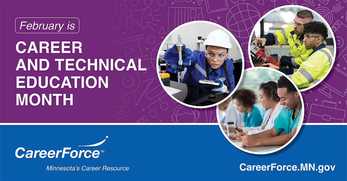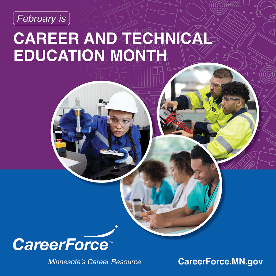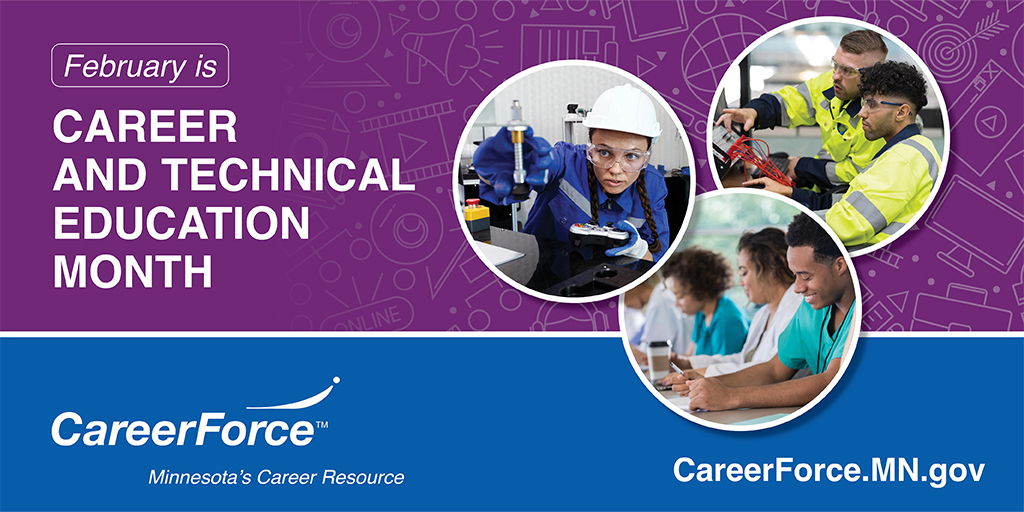 In Minnesota, CareerForce engages in CTE in various ways. Leading CareerForce partner Minnesota Department of Employment and Economic Development (DEED) shares information to help students explore career options and find out what kind of education and training is required for their career path of interest. CareerForce staff reach out to CTE instructors and students to share information about local employment opportunities and to work together on career exploration events large and small. And CareerForce staff can help guide people in exploring available CTE opportunities to help determine what might be the best option.